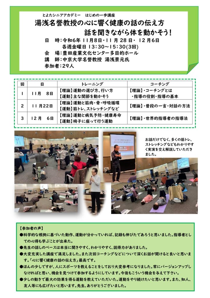 はじめの一歩講座「湯浅名誉教授の心に響く健康の話の伝え方~話を聞きながら体を動かそう!~」講座風景