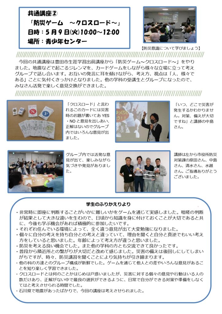5月の講座風景(通年コース・共通講座「防災ゲーム~クロスロード~」)