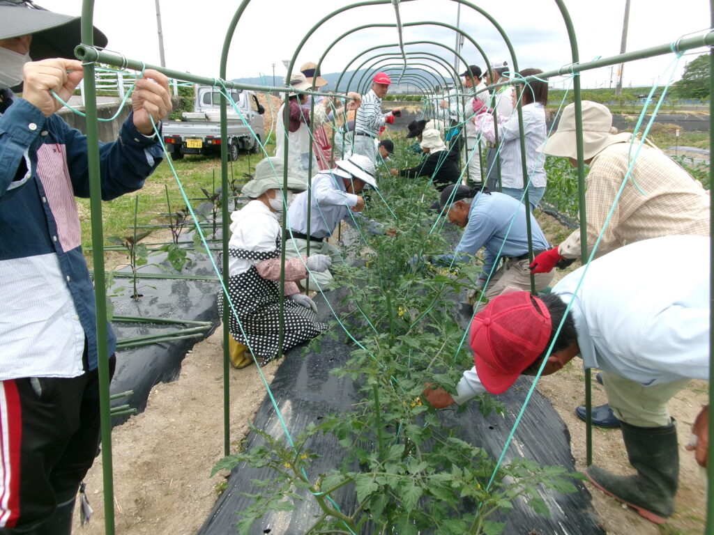 ミニトマト2本仕立てに誘引